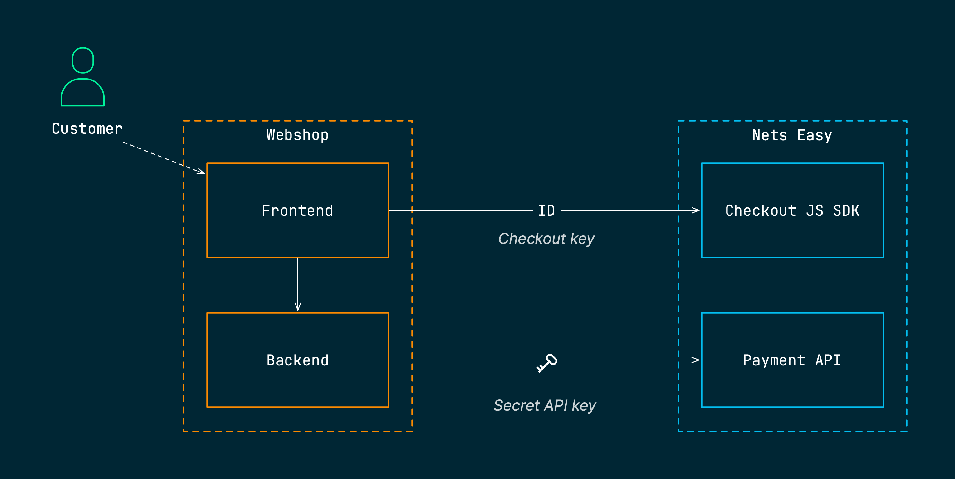 The customer interacts with your website exclusively when using an embedded checkout. The backend of your website communicates with Nexi Group over the RESTful Payment API using your secret API key. The frontend of your website uses the Checkout JS SDK, provided by Nexi Group, to handle the API integration with Checkout. The frontend of your site uses the checkout key to identify your webshop when communicating with Nexi Group.